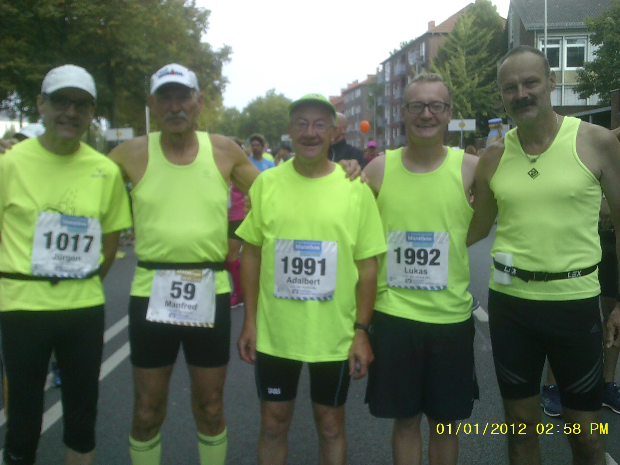 Wie so oft in diesem Jahr hatten die Läufer des Münster-Marathons bestes Laufwetter. Schon im Startbereich trafen sich die Non-Stop-Ultras. Jürgen, Manfred, Adalbert, Lukas und Norbert vor dem Start beim Münster-Marathon…